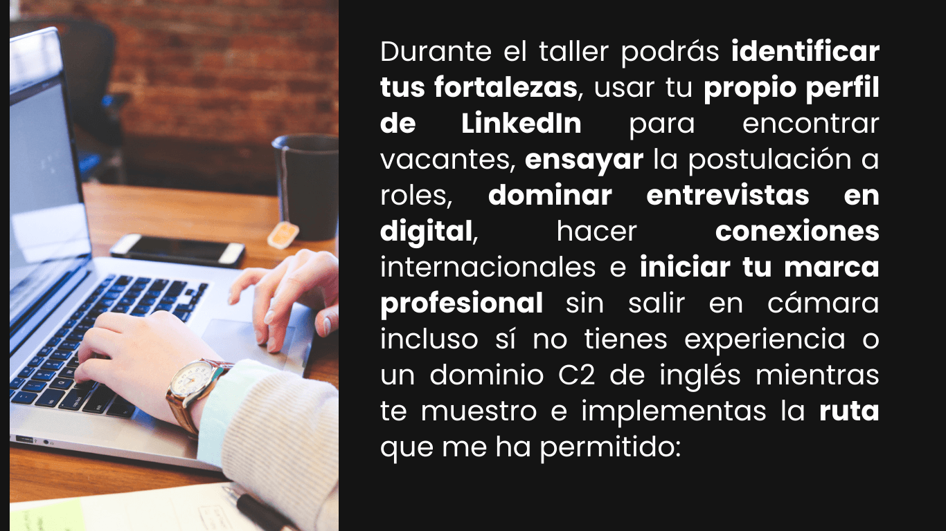 ➡️ Conocer herramientas digitales gratuitas que te pongan en el radar de las empresas más importantes, conectes con talento global y te posiciones con algo que nadie te puede quitar: tu marca profesional digital.